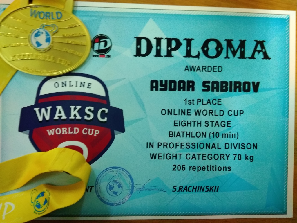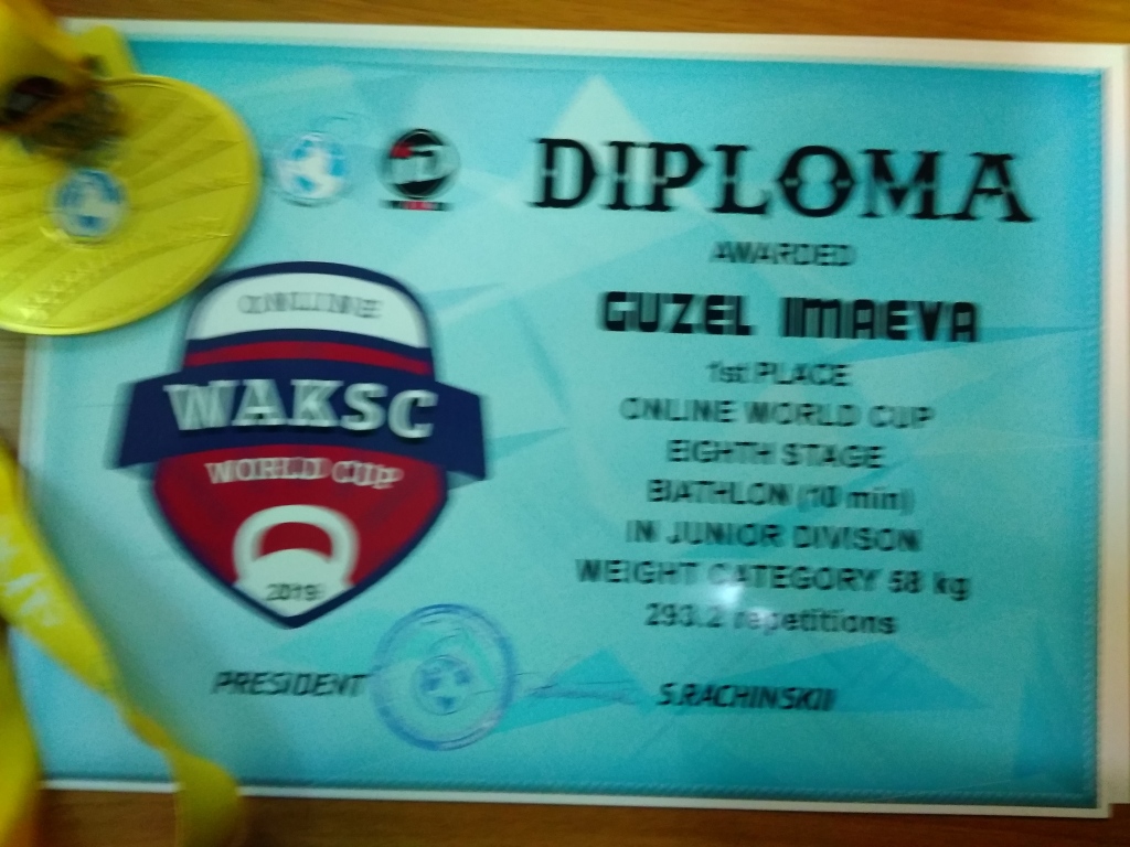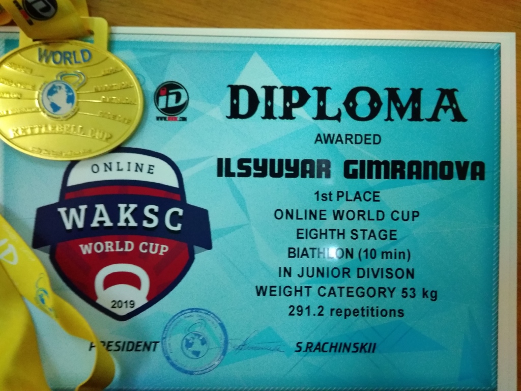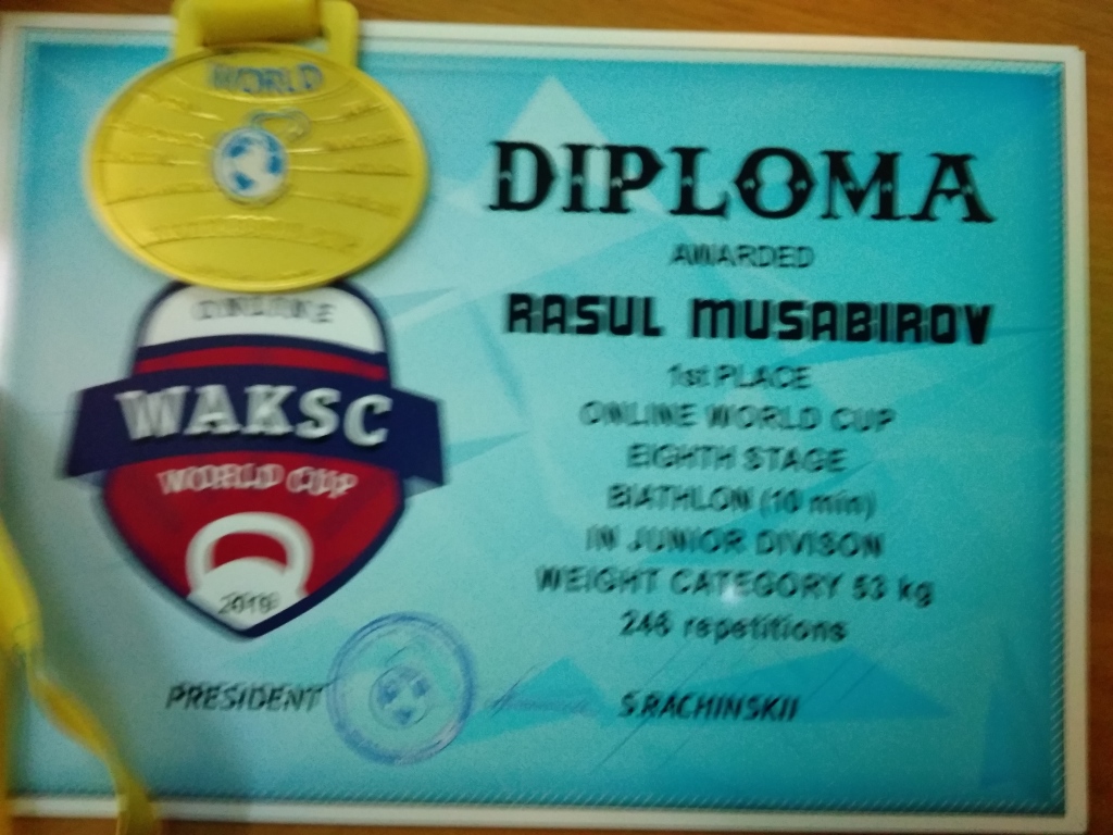 Спортсмены-гиревики приняли участие и на восьмом этапе онлайн Чемпионата Кубка Мира по гиревому спорту. На этот раз медали были на порядок выше, четыре золото и одно серебро. После просморта выступлений спортсменов, судейской колегией было вынесено решение: Сабиров Айдар Наилевич, в весовой категории до 78 кг, занял первое место среди профессионалов. Среди юниоров: первые места заняли Алмаз Шангареев (73+кг), Ильсюяр Гимранова (53 кг), Расуль Мусабиров (53 кг), Гузель Имаева (58 кг), второе место — Лилиана Хасанова (68+ кг). поздравляем всех спортсменов и желаем достичь еще больших результатов.